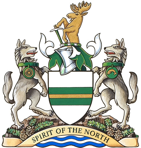 CrestBlazonA demi moose Or its dexter hoof resting on a miner’s pick Argent hafted Vert; SymbolismThe moose is a local animal known for its strength and resilience. The miner’s pick indicates the original importance of mining in the region’s economy. |