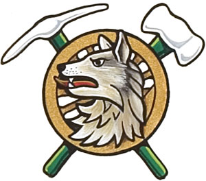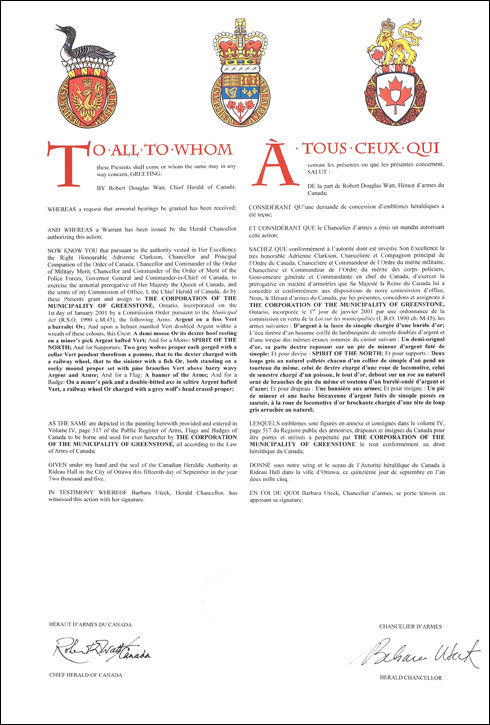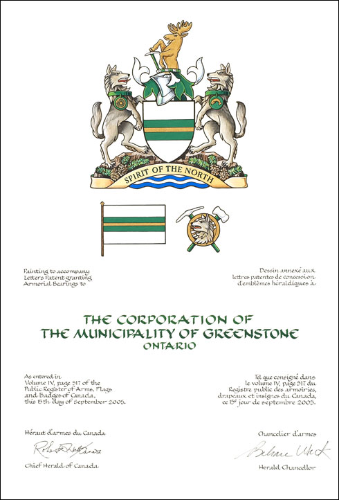 Badge of The Corporation of the Municipality of GreenstoneBlazonOn a miner’s pick and a double-bitted axe in saltire Argent hafted Vert, a railway wheel Or charged with a grey wolf’s head erased proper; SymbolismThe badge combines references to the mining and forestry industries, the railway, and the wolf supporters. |