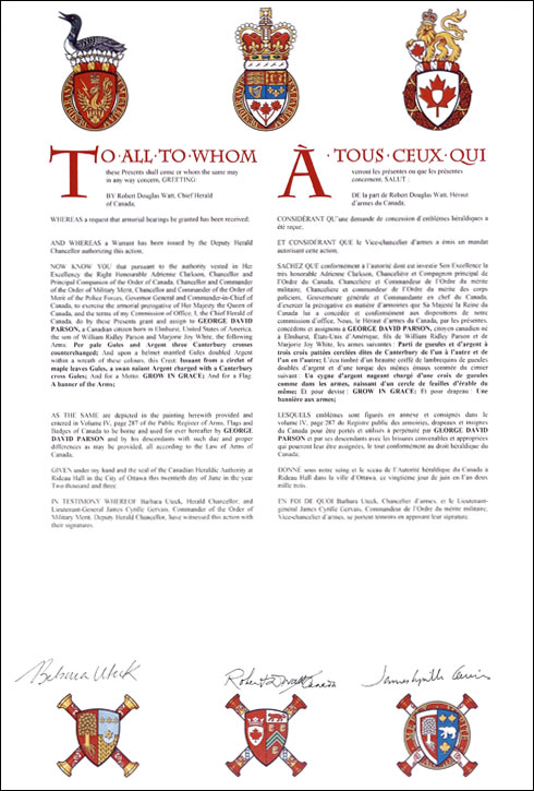 Additional InformationCreator(s)Original concept of George David Parson and Arthur Potts, assisted by the Heralds of the Canadian Heraldic Authority PainterEva Pilar-Cass CalligrapherNancy Ellis Recipient TypeIndividual |