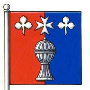 Arms of Fredrick John Butler-CaughieBlazonPer pale Gules and Azure a covered cup and in chief a Maltese cross between two trefoils Argent; SymbolismThe colour red represents the blood of Christ, in whose name Major Butler-Caughie serves, and the blue represents the Holy Spirit who empowers him. The red and white colours also allude to his affection for his country, these being the colours of Canada. The cup symbolizes the name “Butler”, as well as service to God and humankind. The Maltese cross alludes to his charitable activities and his service as a chaplain in the Canadian Forces. Each of the trefoils represents the Holy Trinity. |
