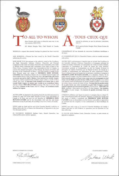 Additional InformationCreator(s)Original concept of Fredrick Butler-Caughie, assisted by Darrel Kennedy, Assiniboine Herald, and the Heralds of the Canadian Heraldic Authority. PainterRobert Grey CalligrapherShirley Mangione Recipient TypeIndividual |