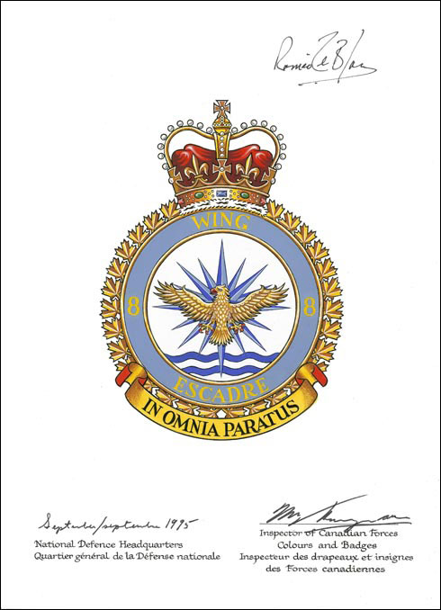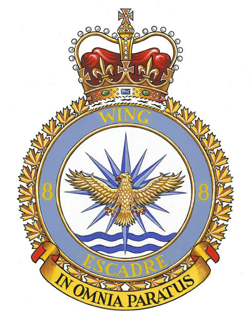 Badge of 8 WingBlazonArgent two bars wavy in base and over all a sixteen point compass rose Azure surmounted by an eagle displayed Or armed langued and beaked Gules; SymbolismThe eagle indicates the Wing’s power for operational missions and tasks. The compass points refer to the many units within the Wing and their wide-ranging ability. The blue wavy bars symbolize the Wing’s current location on the Trent-Severn Waterway. |