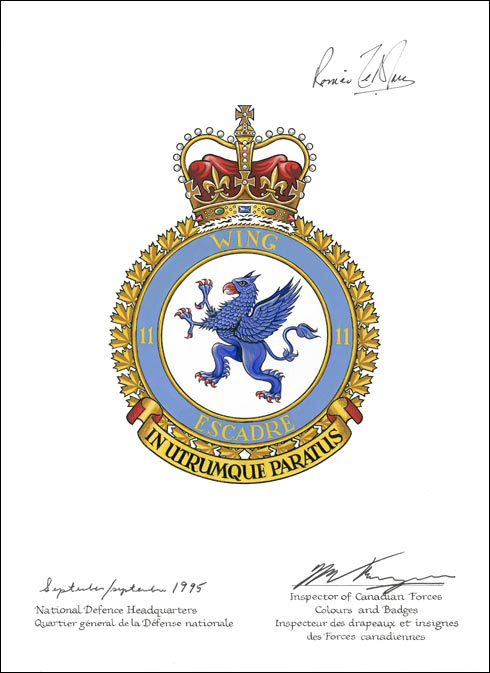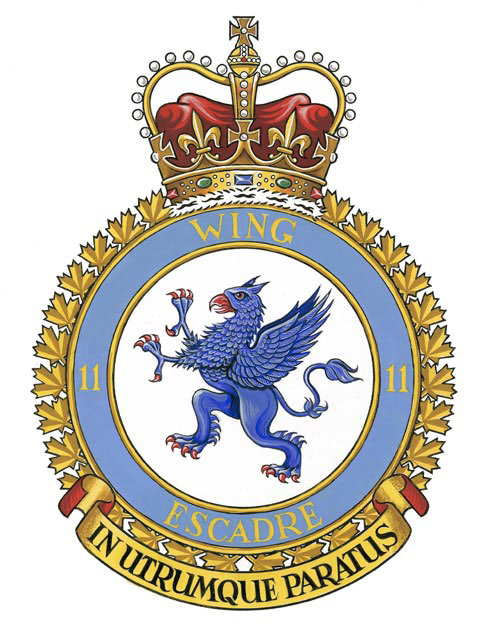 Badge of 11 WingBlazonArgent a griffin segreant Azure armed langued and beaked Gules; SymbolismThe griffin, half eagle, half lion, symbolizes the Wing's provision of air support to land forces. The eagle's eyes and wings are representative of the Wing's keen vision and power of flight, while the lion's body portrays its courage and strength. The colours blue and red indicate the air force and army elements of the Wing's role. |