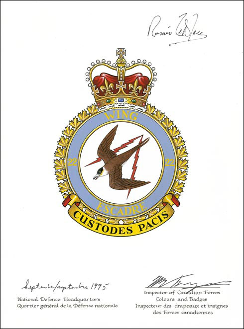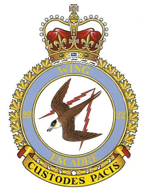 Badge of 22 WingBlazonArgent two lightning bolts Gules conjoined in sinister chief extending chevronwise to the dexter flank and base respectively over all a jaeger volant recursant descendant in bend sinister proper; SymbolismThe jaeger inhabits the Arctic and coastal islands, possesses exceptionally keen eyesight, and is extremely aggressive when protecting its territory. It thus represents the Wing’s resources employed to protect Canadian territory and airspace. The lightning bolts symbolize the aerospace defense system’s communications and surveillance devices. |