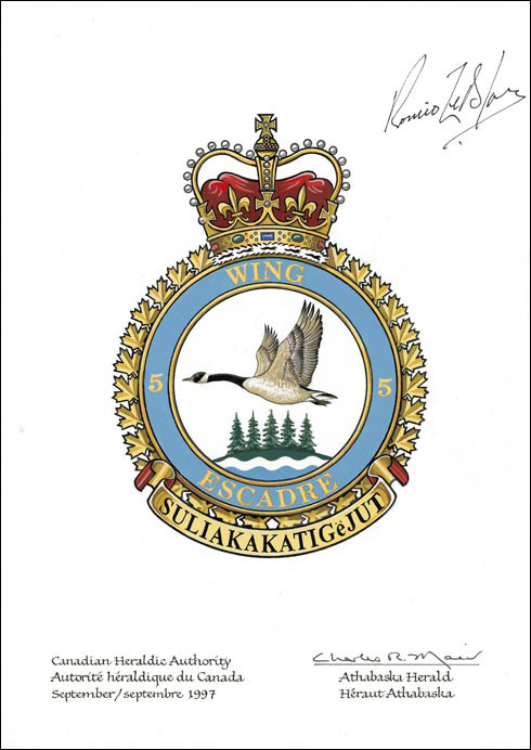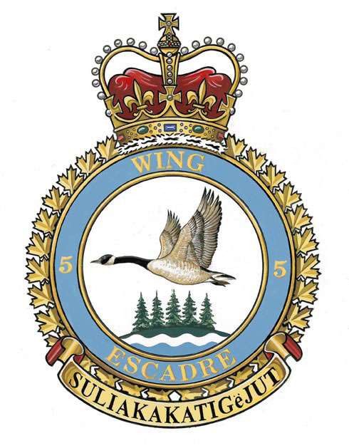 Badge of 5 WingBlazonArgent a Canada Goose volant above five spruce trees growing on a grassy mound all proper issuant from a base barry wavy Argent and Azure; SymbolismThe Canada Goose refers to the fact that 5 Wing is located at Goose Bay, Labrador. The badge includes five spruce trees along with symbols for land and sea recalling the Labrador coast. |
