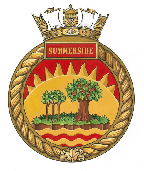 Badge of HMCS SummersideBlazonGules a demi sun in splendour Or issuant in base charged with an island Vert to the sinister an oak tree fructed to the dexter thereof three oak saplings sprouting all proper the island rising out of barry wavy Or and Gules; SymbolismThe sun and the wavy bars recall summer and waves, thus alluding to the ship’s name. The island and the oak trees are found in the arms of Prince Edward Island, where the city of Summerside is located. |