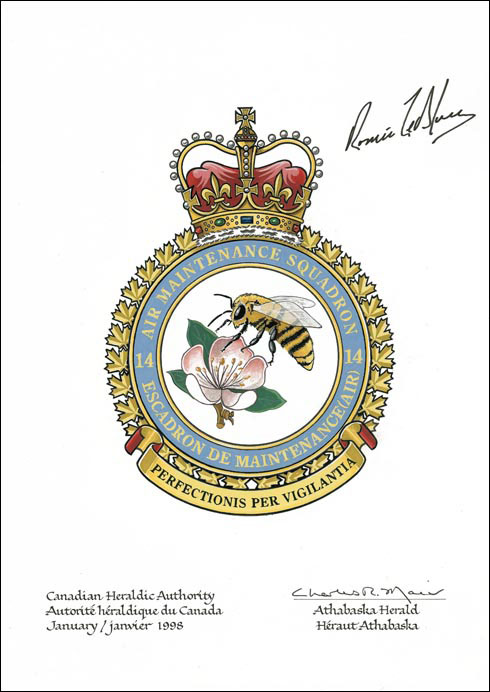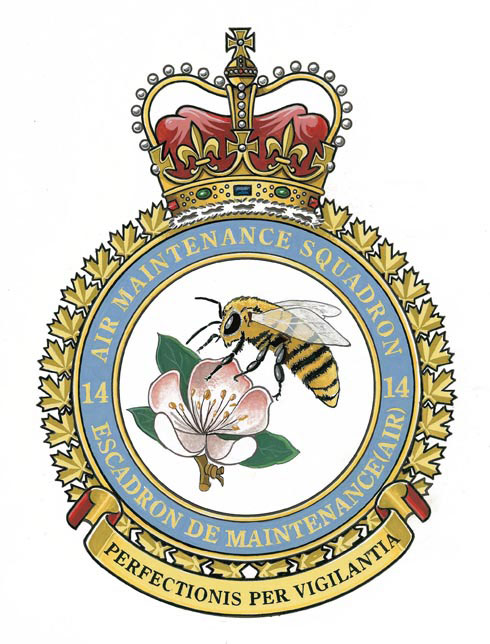 Badge of 14 Air Maintenance SquadronBlazonA bee a lighting upon an apple blossom slipped and leaved proper; SymbolismThe apple blossom recalls the Annapolis Valley where the Squadron is based, and the worker honey bee represents the members of the Squadron. |