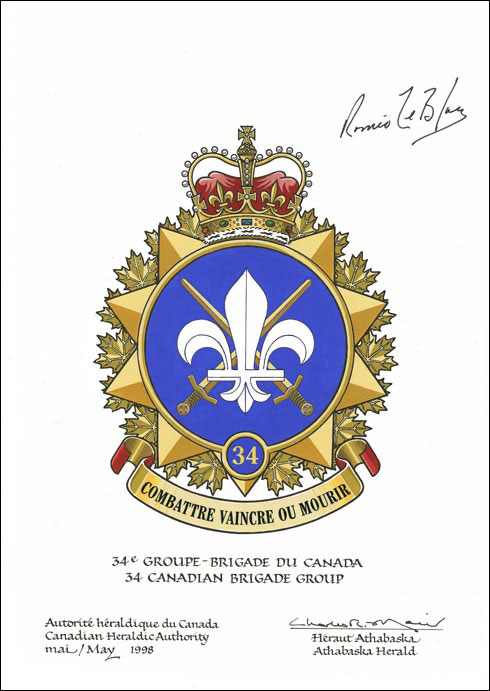 Badge of 34 Canadian Brigade GroupBlazonAzure upon two Crusader’s swords in saltire Or a fleur-de-lis Argent; SymbolismThe white fleur-de-lis on the blue background symbolizes the Province of Quebec where the Brigade has its headquarters. The crossed swords refer to the unit’s military role. |