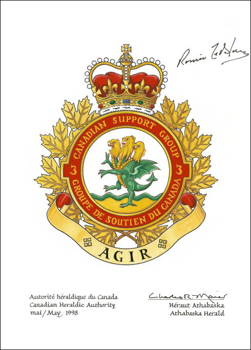 Additional InformationCreator(s)Not available PainterNot available CalligrapherNot applicable Recipient TypeMilitary Institution Other InformationThe recipient's emblems have been subsequently confirmed in the name of 3 Canadian Support Unit in the Public Register of Arms, Flags and Badges of Canada, Vol. VI, p. 40, 15 March 2011. |