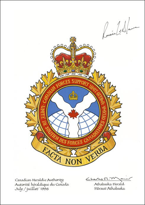 Badge of the Canadian Forces Support Unit OttawaBlazonAzure a demi terrestrial globe issuant in base Argent its geographic grid Azure over all a pall wavy Argent charged at the crossing with a maple leaf Gules in chief a representation of the Royal Crown Or all within an annulus Gules fimbriated and inscribed with the Unit’s title in letters Or; SymbolismElements from the Arms of the Regional Municipality of Ottawa-Carleton have been arranged on a field recalling the global mandate of the unit to serve Canadian Forces in all parts of the world. |
