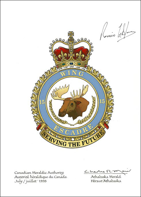 Badge of 15 WingBlazonArgent between two ears of wheat their stems conjoined in base Or a moose head erased in trian aspect proper attired Or; SymbolismThe moose refers to the Wing’s location at Moose Jaw, Saskatchewan, an area known for its wheat production. |