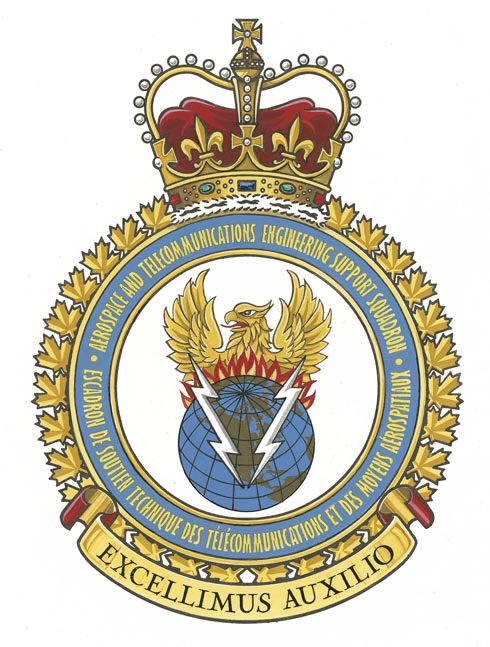 Badge of the Aerospace and Telecommunications Engineering Support SquadronBlazonUpon a terrestrial globe a phoenix Or rising out of its flames proper between two flashes of lightning Argent issuant from the base of the globe; SymbolismThe phoenix and lightning flashes symbolize development, repair and operations of aerospace and telecommunications equipment in support of global operations of the Air Force. |
