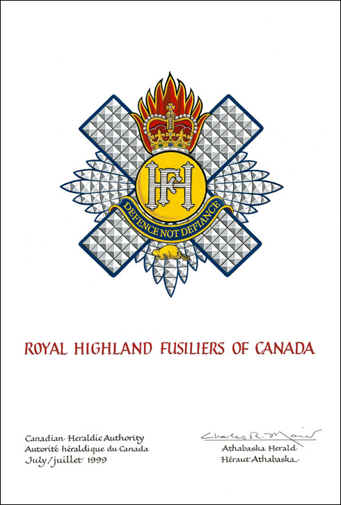 Badge of The Royal Highland Fusiliers of CanadaBlazonA grenade Or fired inscribed with the monogram HF Argent the flame surmounted by the Royal Crown proper at the base of the grenade a scroll Azure bearing the motto DEFENCE NOT DEFIANCE and thereunder a beaver couchant Or the whole resting on a Thistle Star Argent fimbriated Azure; SymbolismThe star of the Order of the Thistle is a traditional element associated with highland regiments. The grenade refers to the regiment's fusilier status. The Crown represents both the regiment's loyal service and the appellation Royal accorded by Her Majesty the Queen in 1998. |