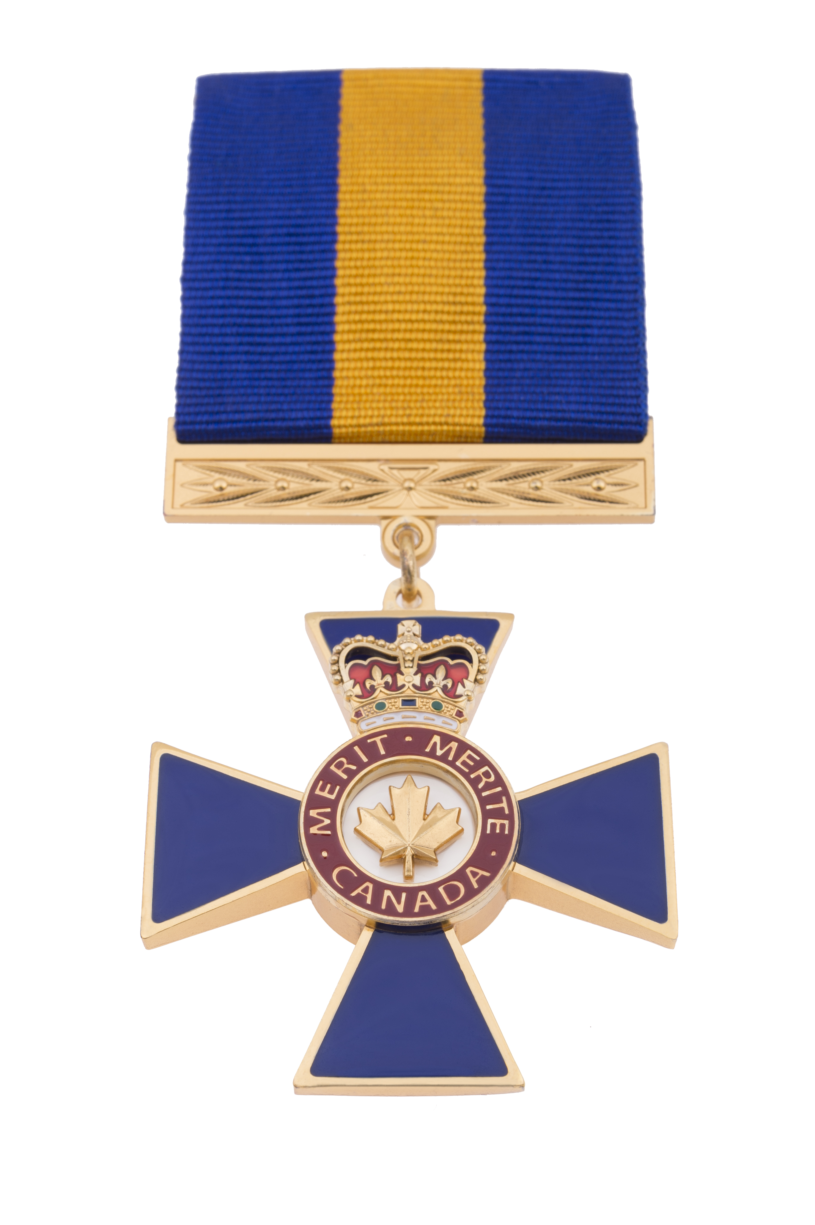 The badge of the Order is the same as that of the Order of Military Merit, a blue-enamelled, straight-end cross (four arms, narrow at the centre, wider at the ends) with an annulus in red surmounted by St. Edward’s Crown. The annulus bears the inscription MERIT.MÉRITE.CANADA.