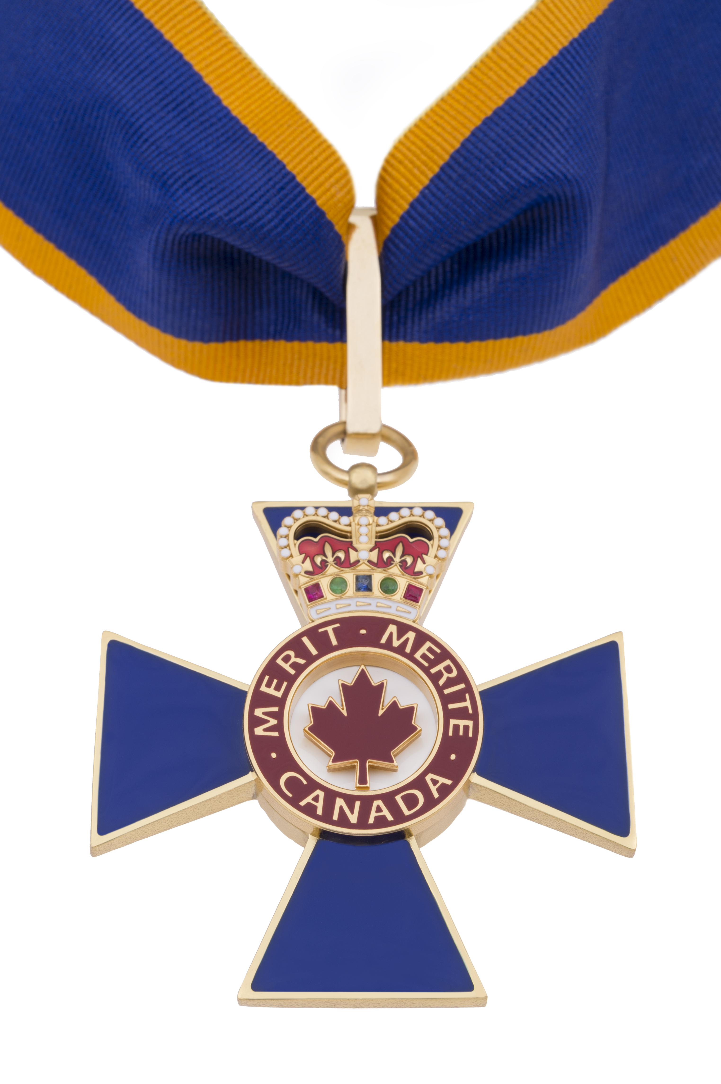 The badge of the Order is a blue-enamelled, straight-end cross (four arms, narrow at the centre, wider at the ends) with an annulus in red surmounted by St. Edward’s Crown. The annulus bears the inscription MERIT.MÉRITE.CANADA.