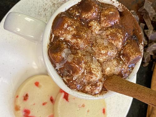 - In a stainless steel or tempered glass bowl, add the chocolate, cocoa and cinnamon. Pour in one-third of the warm milk and whisk until it forms a smooth, silky paste. Add the remaining milk and whisk until combined.