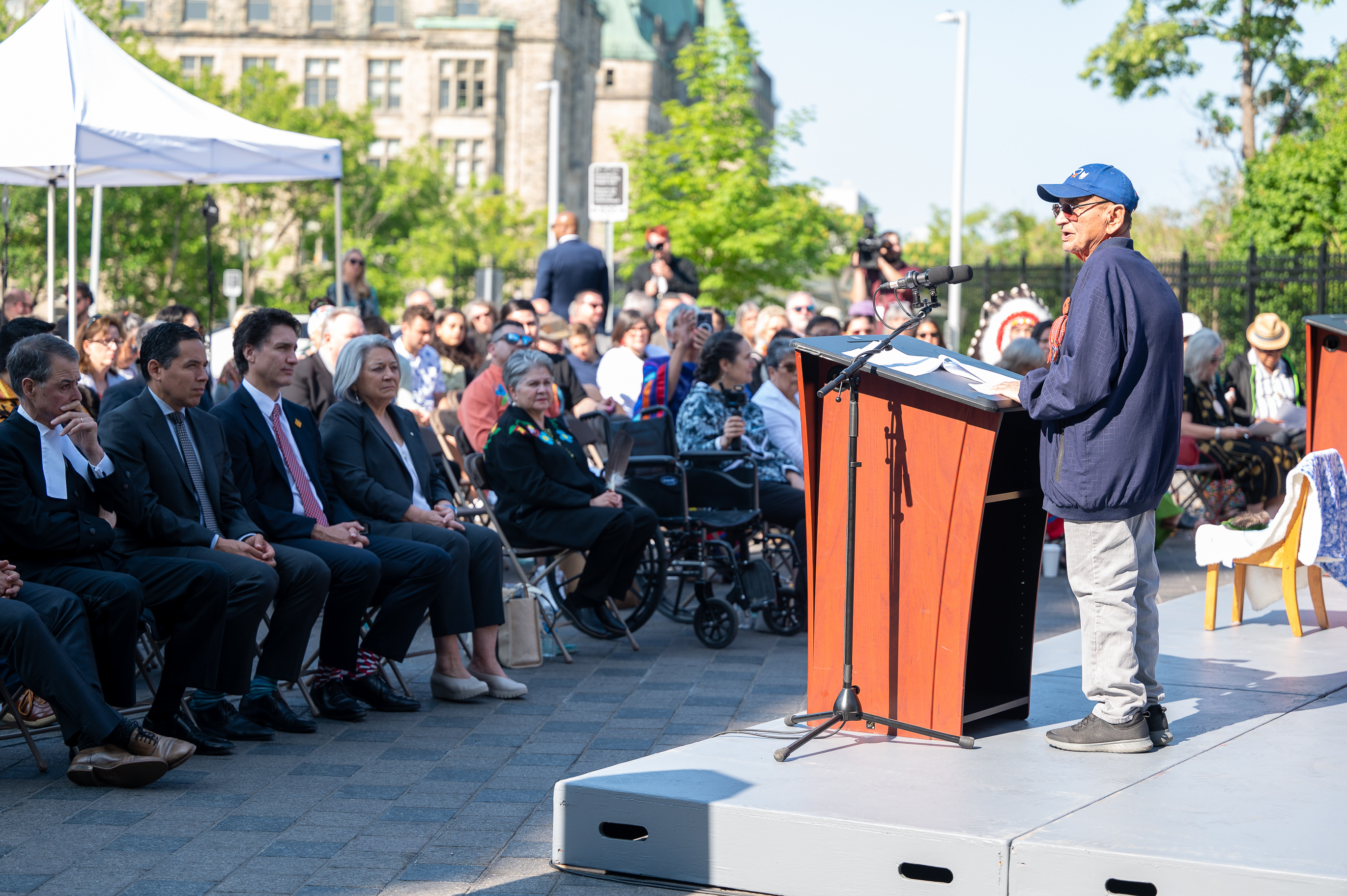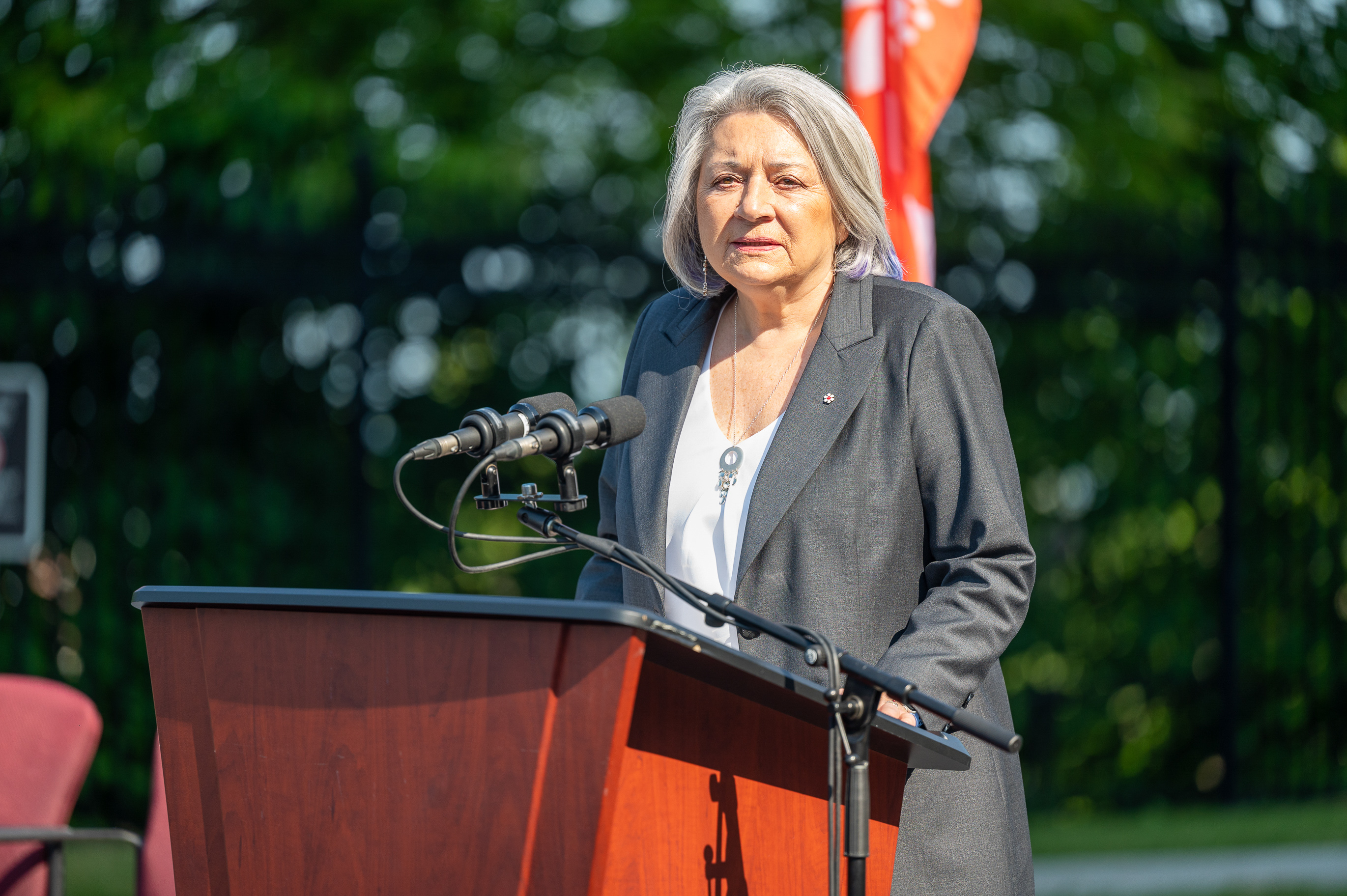 Son Excellence la très honorable Mary Simon, gouverneure générale du Canada, a prononcé un discours lors de la cérémonie de sélection du site du Monument national sur les pensionnats autochtones le 20 juin à 8 h 30 sur la terrasse de l’édifice de l’Ouest, Colline du Parlement, Ottawa.