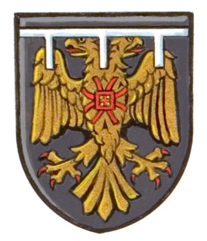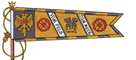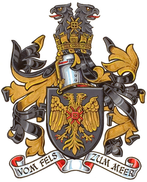 DeviseBlasonVOM FELS ZUM MEER; SymbolismeVOM FELS ZUM MEER, signifiant « De la pointe rocheuse à la mer », est une phrase que M. Halbländer a choisie pour faire référence à son nom, à son lieu de résidence au Canada en bordure de l’escarpement de Niagara, au paysage de sa région ancestrale en Allemagne et à sa carrière navale. |