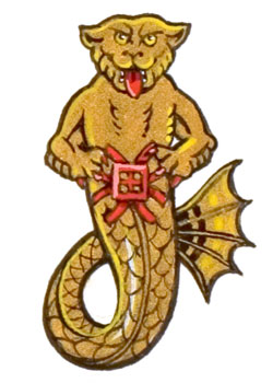 Insigne de Craig James HalbländerBlasonUne lionne marinée d’or posée de front tenant deux anilles fusionnées en croix de gueules; SymbolismeL'insigne montre la double anille retenue par une lionne marinée (dotée d’une queue de poisson) représentant la fille de M. et Mme Halbländer, Alice, née en Angleterre dans le comté de Kent, dont les armoiries ont comme support un lion mariné. |