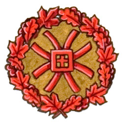 Insigne de Craig James HalbländerBlasonUn besant d’or chargé de deux anilles fusionnées en croix de gueules, cerclé d’une guirlande de feuilles d’érable et de feuilles de chêne, le tout du même; SymbolismeL'insigne montre la double anille des armes entourée d’une couronne de feuilles d’érable et de noyer rappelant le Canada et la Grande-Bretagne et faisant référence au mariage de M. Halbländer à Julia Halbländer-Smyth, qui est anglaise. |