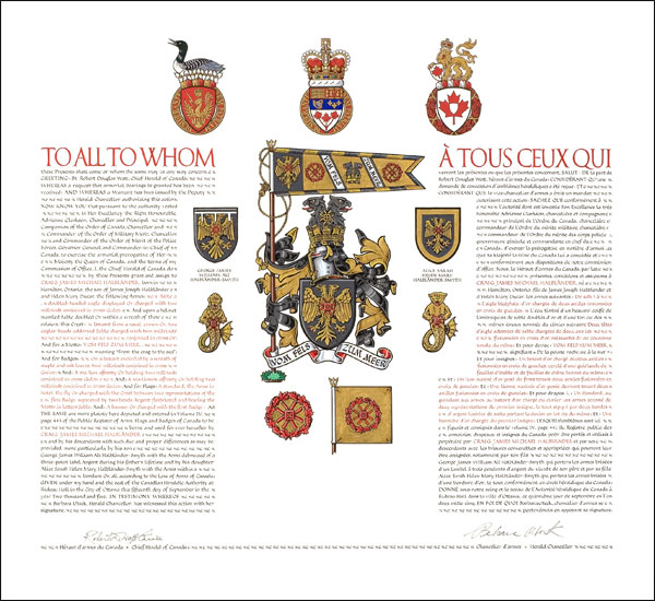 Concession d’armoiries, de drapeaux et d’insignes, avec brisures à George James William Ali Halbländer-Smyth et à Alice Sarah Helen Mary Halbländer-Smyth