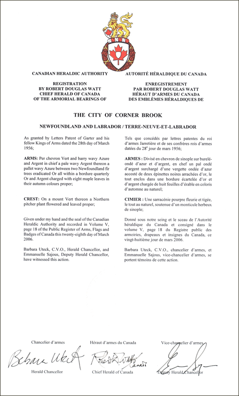 Armoiries de The City of Corner BrookBlasonDivisé en chevron de sinople sur burelé-ondé d’azur et d’argent, en chef un pal ondé d’argent surchargé d’une vergette ondée d’azur accosté de deux épinettes noires arrachées d’or, le tout enclos dans une bordure écartelée d’or et d’argent chargée de huit feuilles d’érable en coloris d’automne au naturel; SymbolismeLe vert et le bleu symbolisent les forêts et les eaux du bras de mer Humber, représenté par les bandes ondulées horizontales, qui fait partie de la baie des Îles, où se situe la ville. La bande ondulée verticale symbolise le ruisseau de Corner Brook, petit cours d’eau traversant la ville et se jetant dans le bras de mer Humber. Les deux sapins baumiers font référence aux usines de papier qui sont au cœur de l’économie et de l’histoire de la ville. Les feuilles d’érable ornant la bordure divisée en quatre parties symbolisent le Canada, ainsi que les huit quartiers de la ville qui ont été créées lors de la fusion de quatre communautés au sein de Corner Brook en 1965. |