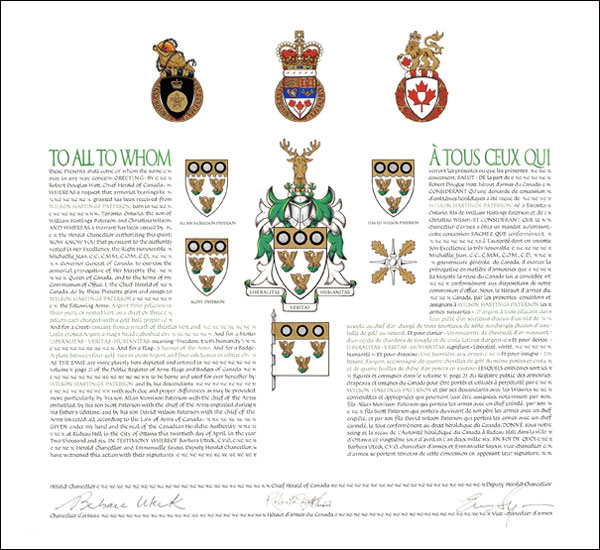 Concession d’armoiries, d’un drapeau et d’un insigne, avec brisures à Allan Morrison Paterson, à Scott Hastings Paterson et à David Wilson Paterson