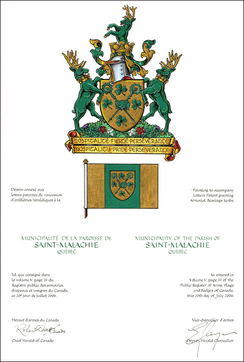 SupportsBlasonDeux cerfs de Virginie de sinople, ramés et onglés d’or, colletés chacun d’une couronne de feuilles d’érable et de cônes de sapin du même, debout sur une terrasse herbeuse ornée de lis, de roses, de trèfles et de chardons, le tout au naturel; SymbolismeLes couronnes de cônes de sapin et de feuilles d’érable passées aux cous des cerfs de Virginie évoquent l’importance de la foresterie et l’acériculture à Saint-Malachie. Les lis, les roses, les trèfles et les chardons sur la terrasse rappellent les origines françaises, anglaises, irlandaises et écossaises des premiers habitants de la ville. |