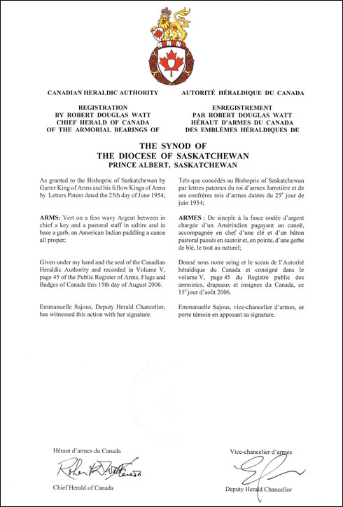 Armoiries de The Synod of the Diocese of SaskatchewanBlasonDe sinople à la fasce ondée d’argent chargée d’un Autochtone pagayant un canoë, accompagnée en chef d’une clé et d’un bâton pastoral passés en sautoir et, en pointe, d’une gerbe de blé, le tout au naturel; SymbolismeLa clé et le bâton pastoral sont des emblèmes de l’autorité épiscopale. La personne autochtone en canot représente la partie nord du diocèse d’origine, caractérisée par des rivières et des forêts. La gerbe de blé représente la partie sud de la Saskatchewan, caractérisée par l’agriculture. La bande ondulée évoque la rivière Saskatchewan, d’où le diocèse tire son nom. |