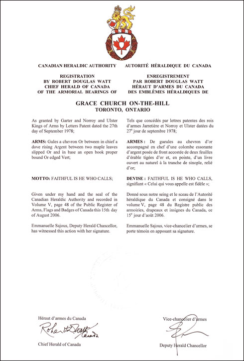 Armoiries de Grace Church-on-the-HillBlasonDe gueules au chevron d’or accompagné en chef d’une colombe essorante d’argent posée de front accostée de deux feuilles d’érable tigées d’or et, en pointe, d’un livre ouvert au naturel à la tranche de sinople, relié d’or; SymbolismeLe rouge est la couleur liée au Saint-Esprit. Le chevron évoque Forest Hill, la colline associée au nom de l’église. La colombe symbolise la grâce de Dieu et fait écho au nom de l’église. Les feuilles d’érable dénotent l’identité canadienne de l’église. Le livre représente les Saintes Écritures. |