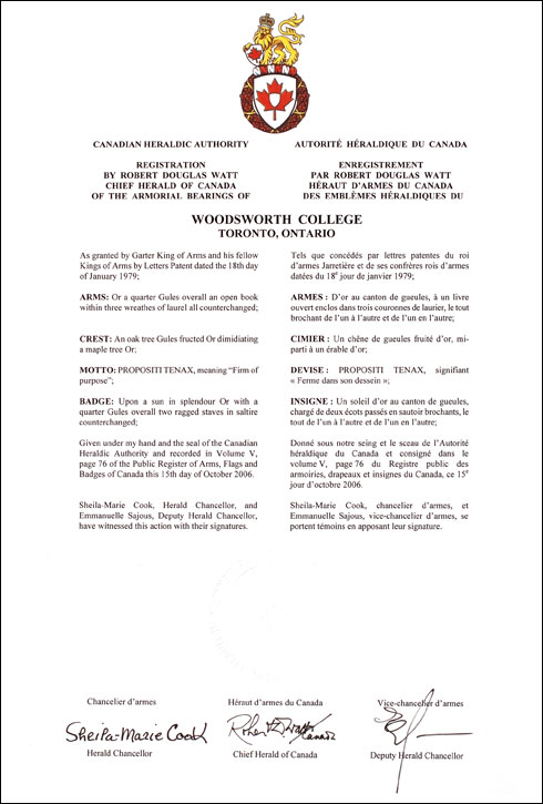 Insigne du Woodsworth CollegeBlasonUn soleil d’or au canton de gueules, chargé de deux écots passés en sautoir brochants, le tout de l’un à l’autre et de l’un en l’autre; SymbolismeLes écots font allusion à la première partie du nom Woodsworth (wood signifiant « bois » en anglais). Le soleil et ses rayons flamboyants représentent la valeur académique, et font allusion à la deuxième partie du nom du collège (worth signifiant « valeur » en anglais). L’alternance des couleurs rappelle celle de l’écu. |