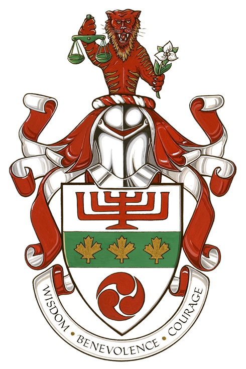 CimierBlasonUn demi-tigre de gueules rayé d’or posé de front, tenant de sa patte dextre une balance de sinople et de sa patte senestre un trille tigé et feuillé au naturel; SymbolismeLe tigre cramoisi évoque le groupe d’athlètes d’élite associé depuis les années 1970 au Yamanaka Budo Life Centre, l’école de M. Yamanaka. La balance symbolise sa fonction de juge de paix en Ontario. |