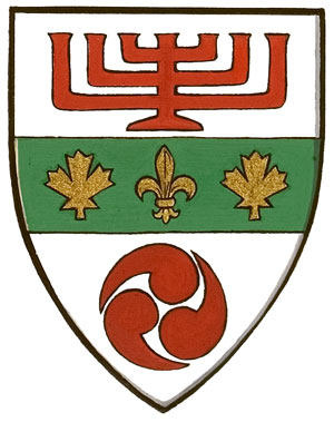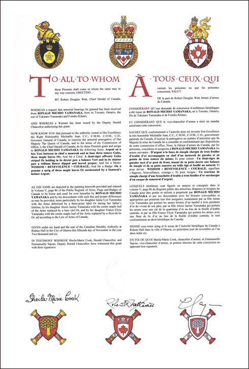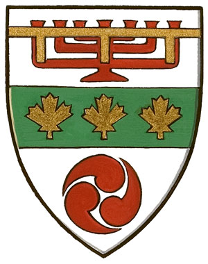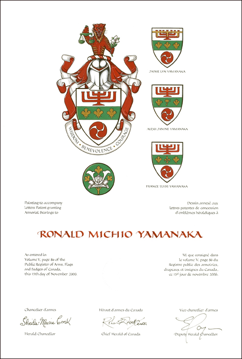Armoiries de Ronald Michio YamanakaBlasonD’argent à la fasce de sinople chargée de trois feuilles d’érable d’or accompagnée en chef d’un menorah de gueules et en pointe de trois tomoes du même; SymbolismeM. Yamanaka étant juge de paix en Ontario, la balance et la bande centrale de couleur verte symbolisent la fonction qu’il occupe, puisqu’une écharpe verte est portée par dessus la robe de cérémonie. Le menorah représente son épouse et les trois feuilles d’érable, ses trois filles. Les trois gouttes tourbillonnantes sont l’emblème d’Okinawa et évoquent son patrimoine. Le rouge et le blanc sont les couleurs de la ceinture d’art martial que possède M. Yamanaka. |