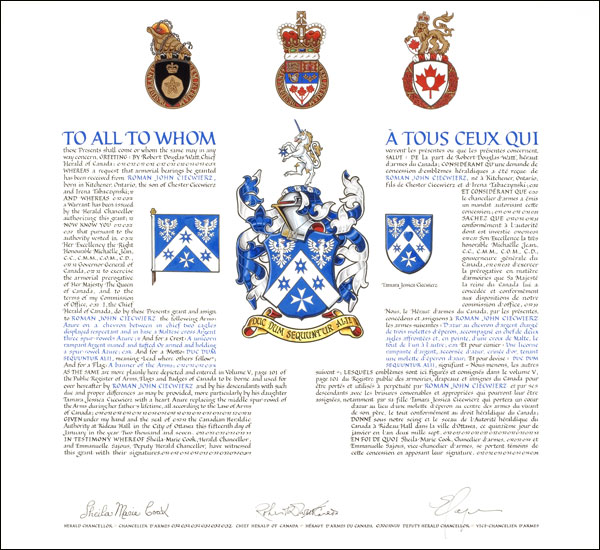 Armoiries de Roman John CiecwierzBlasonD’azur au chevron d’argent chargé de trois molettes d’éperon, accompagné en chef de deux aigles affrontées et, en pointe, d’une croix de Malte, le tout de l’un à l’autre; SymbolismeLa couleur bleue symbolise la vérité et la loyauté. Elle représente également le ciel et l’eau, deux éléments associés au vol ainsi qu’à la plongée sous-marine. Pour M. Ciecwierz, le chevron est symbole de services loyaux, tandis que les aigles représentent lui-même, son épouse et sa fille. Les aigles rappellent aussi les origines polonaises de ses parents. La croix de Malte évoque le travail, les idéaux et le service à autrui de l’Ordre très vénérable de l’Hôpital de Saint-Jean de Jérusalem et autres organisations caritatives. |
