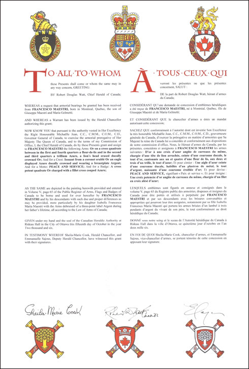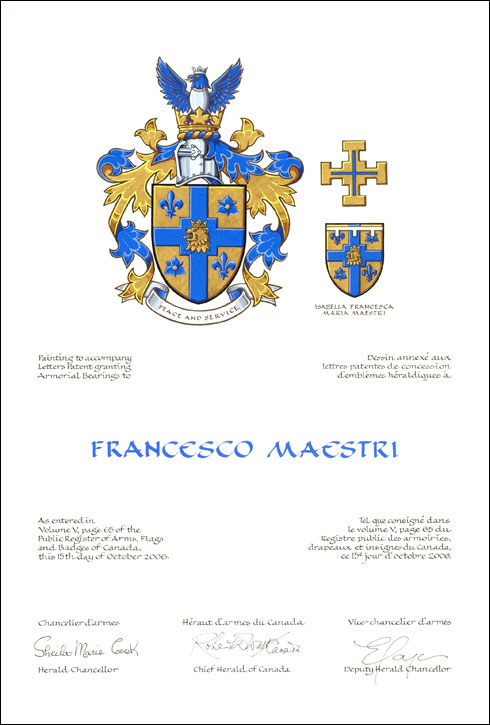 Armoiries de Francesco MaestriBlasonD’or à une croix d’azur anglée de carreaux du même, chargée d’une tête de lion arrachée, ceinte d’une couronne ducale, le tout d’or, cantonnée aux un et quatre d’une fleur de lis, aux deux et trois d’un trille, le tout d’azur; SymbolismeLa croix bleue sur fond or a été reprise du drapeau de Parme, la province italienne d’où sont venus les parents de M. Maestri. La tête de lion dans le carré bleu au centre provient des anciennes armoiries des Maestri en Italie. La fleur de lis représente le Québec, province natale de M. Maestri, tandis que le trille représente l’Ontario, sa province de résidence. Ces fleurs font également référence, respectivement, aux insignes des corps policiers des deux provinces où il a exercé le métier d’agent de police. |