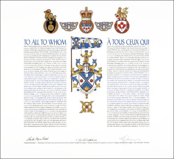 Informations additionnellesCréateur(s)Concept original de David Hjalmarson, assisté par les hérauts de l’Autorité héraldique du Canada. Artiste-peintreRobert Grey CalligrapheShirley Mangione Type de récipiendaireIndividuel |