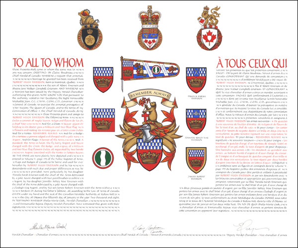 Concession d’armoiries, de drapeaux et d’un insigne, avec brisure à Pamela Sarah Emerson, à Jennifer Ashley Mae Emerson, et à James Robert Emerson