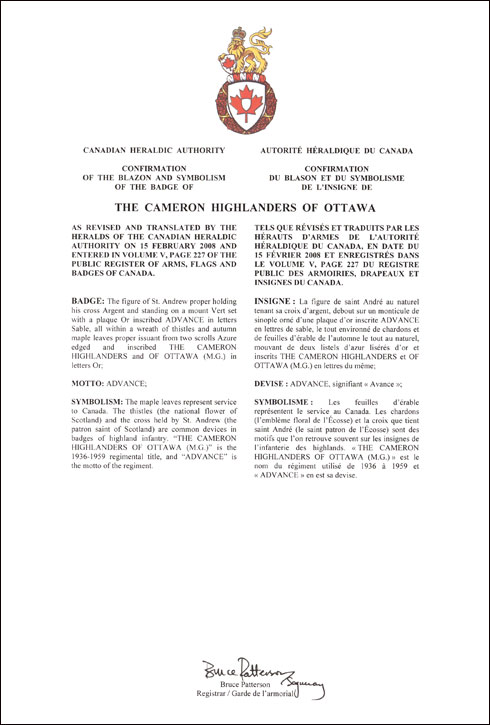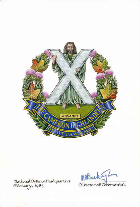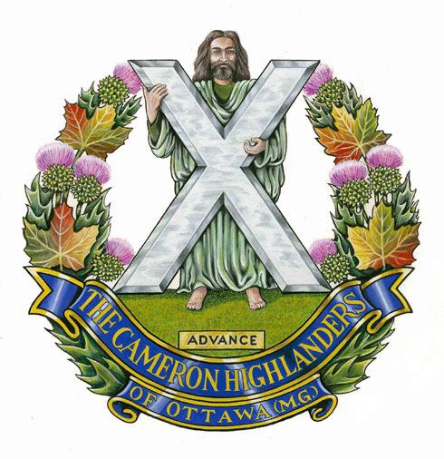 Insigne de The Cameron Highlanders of OttawaBlasonLa figure de saint André au naturel tenant sa croix d’argent, debout sur un monticule de sinople orné d’une plaque d’or inscrite ADVANCE en lettres de sable, le tout environné de chardons et de feuilles d’érable de l’automne le tout au naturel, mouvant de deux listels d’azur lisérés d’or et inscrits THE CAMERON HIGHLANDERS et OF OTTAWA (M.G.) en lettres du même; SymbolismeLes feuilles d’érable représentent le service au Canada. Les chardons (l’emblème floral de l’Écosse) et la croix que tient saint André (le saint patron de l’Écosse) sont des motifs que l’on retrouve souvent sur les insignes de l’infanterie des highlands. « THE CAMERON HIGHLANDERS OF OTTAWA (M.G.) » est le nom du régiment utilisé de 1936 à 1959 et « ADVANCE » en est sa devise. |