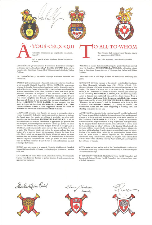L'utilisation du contenu du Registre public est réservée à des fins de recherche uniquement. Les emblèmes héraldiques du Registre ne peuvent être reproduits sous aucune forme ou par quelque procédé que ce soit sans l'autorisation écrite de l'Autorité héraldique du Canada et/ou du récipiendaire.