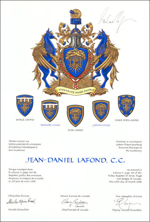 Concession d’armoiries et de supports, avec brisures à Estelle Lafond, à Élise Lafond, à Éléonore Vinais, à Justine Vinais, et à Marie-Éden Lafond