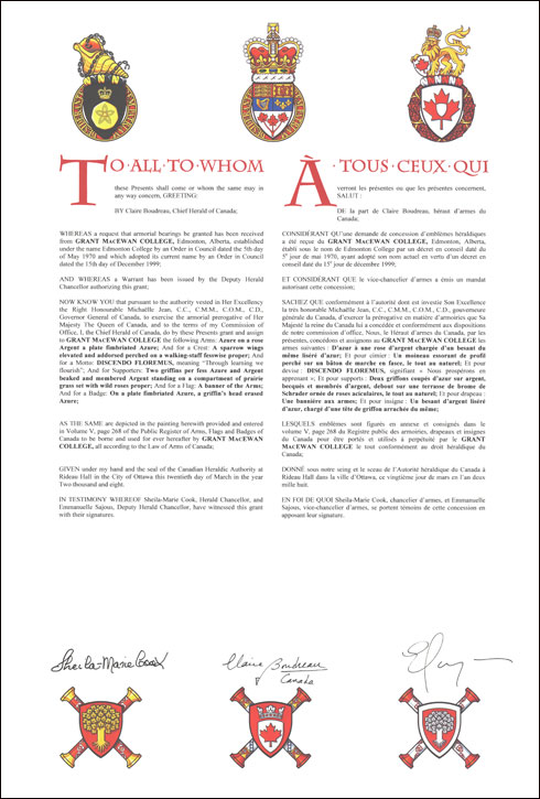 SupportsBlasonDeux griffons coupés d’azur sur argent, becqués et membrés d’argent, debout sur une terrasse de brome de Schrader ornée de roses aciculaires, le tout au naturel; SymbolismeLe griffon est le symbole des équipes sportives du collège (les MacEwan Griffins), symbolisant le courage, la rapidité et l’excellence. La terrasse de brome de Schrader ornée de roses aciculaires représente l’Alberta. |