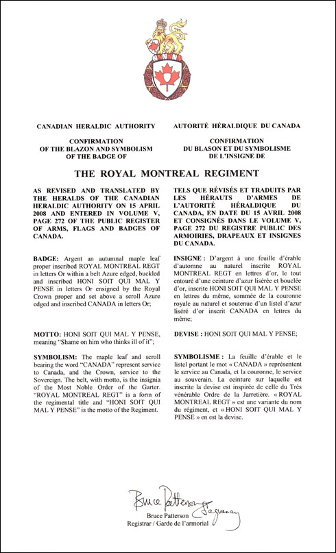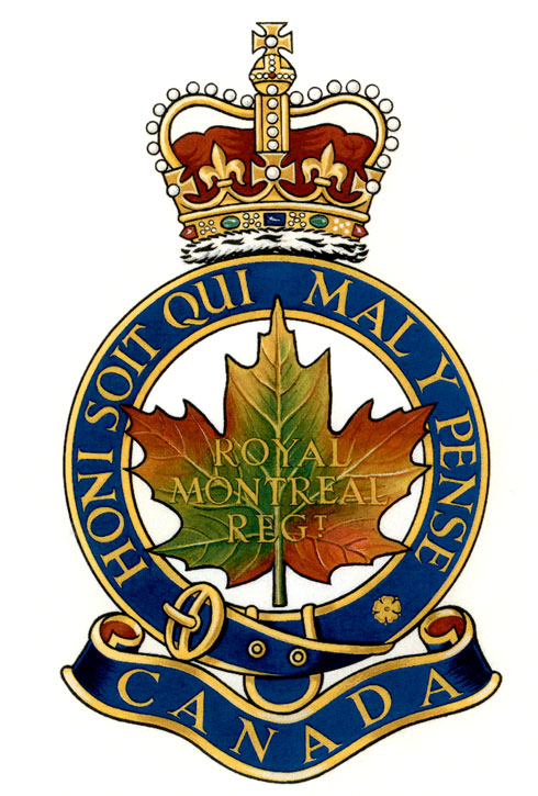 Insigne de The Royal Montreal RegimentBlasonD’argent à une feuille d’érable d’automne au naturel inscrite ROYAL MONTREAL REGT en lettres d’or, le tout entouré d’une ceinture d’azur lisérée et bouclée d’or, inscrite HONI SOIT QUI MAL Y PENSE en lettres du même, sommée de la couronne royale au naturel et soutenue d’un listel d’azur liséré d’or inscrit CANADA en lettres du même; SymbolismeLa feuille d’érable et le listel portant le mot « CANADA » représentent le service au Canada, et la couronne, le service au souverain. La ceinture sur laquelle est inscrite la devise est inspirée de celle du Très vénérable Ordre de la Jarretière. « ROYAL MONTREAL REGT » est une variante du nom du régiment, et « HONI SOIT QUI MAL Y PENSE » en est la devise. |