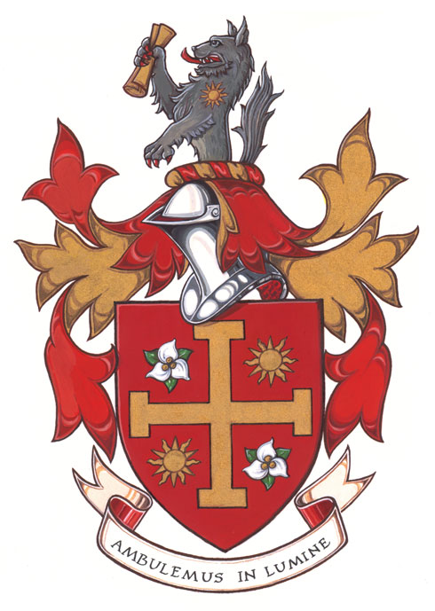 CimierBlasonUn demi-loup au naturel chargé sur l’épaule d’un soleil et tenant de sa patte dextre un rouleau, le tout d’or; SymbolismeLe loup est un animal canadien reconnue pour sa bravoure et sa capacité de s’orienter. Sur son épaule figure un soleil qui rapelle les armes et à la devise. Le parchemin évoque la carrière de M. Ralph en tant qu’avocat et directeur général d’un cabinet de conseillers en affaires et celle du Dre Ligo dans le domaine universitaire. |