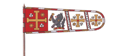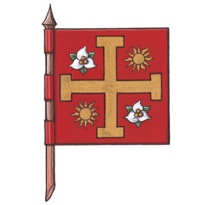 Drapeau de Stevan Bradley Graeme RalphBlasonUn étendard, au guindant aux armes, au battant d’argent chargé du cimier et de deux représentations de l’insigne, le tout séparé par deux bandes d’argent lisérées de gueules inscrites de la devise en lettres de sable; SymbolismeLe symbolisme de cet emblème est compris dans un ou plusieurs éléments de ce dossier. |