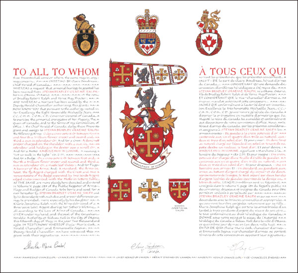Armoiries de Stevan Bradley Graeme RalphBlasonDe gueules à la croix potencée d’or cantonnée aux un et quatre d’un trille au naturel, aux deux et trois d’un soleil d’or; SymbolismeLa croix représente la foi chrétienne de M. Ralph et le trillium blanc, sa province natale, l’Ontario. Quant au soleil, repris du drapeau des Philippines, il représente le pays natal de son épouse, le Dre Vivian Ligo. |