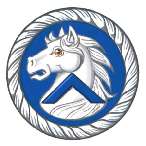 Insigne de Derek Austin TiddBlasonUn tourteau d'azur bordé d'une corde d'argent, à une tête de cheval du même chargée d'une équerre de maçon d'azur; SymbolismeLe cordage évoque à nouveau la voile, et la tête de cheval rappelle le cimier. L’équerre de maçon illustre le fait que M. Tidd est franc-maçon. |