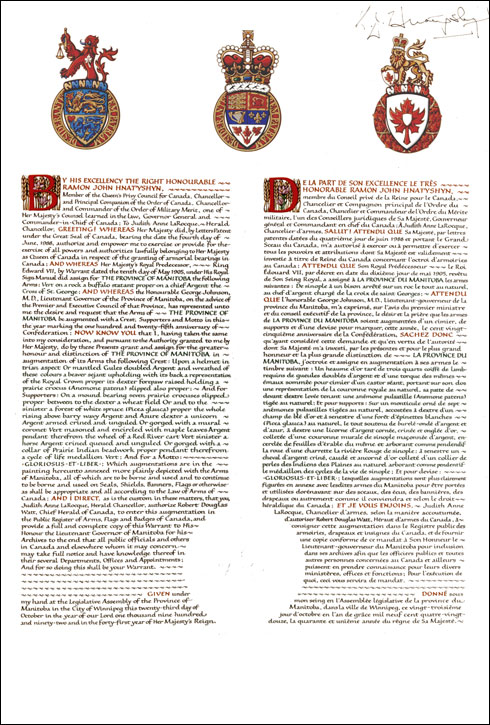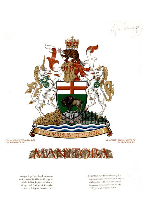 SupportsBlasonSur un monticule orné de sept anémones pulsatilles tigées au naturel, accostées à dextre d'un champ de blé d'or et à senestre d'une forêt d'épinettes blanches (Picea glauca) au naturel, le tout soutenu de burelé-ondé d'argent et d'azur, à dextre une licorne d'argent cornée, crinée et onglée d'or, colletée d'une couronne murale de sinople maçonnée d'argent, encerclée de feuilles d'érable du même et arborant comme pendendif la roue d'une charrette la rivière Rouge de sinople; à senestre un cheval d'argent criné, caudé et ancorné d'or colleté d'un collier de perles des Autochtones des Plaines au naturel arborant comme pendentif le médaillon des cycles de la vie de sinople; SymbolismeLa licorne évoque les premiers colons écossais de la province. Son collier rappelle l’emplacement géographique du Manitoba, situé au centre du pays, et son surnom de keystone province (clé de voûte en français). Il représente également les pierres du fort Garry, un fort de la Compagnie de la Baie d’Hudson à l’époque de la traite des fourrures. Les feuilles d’érable symbolisent le Canada. La roue de charrette de la rivière Rouge représente un mode de transport caractéristique de l’histoire de la région. Le cheval était un animal indispensable pour les Premières nations, les Métis et les colons européens. Le collier de perles et d’os ainsi que le médaillon du cycle de vie rendent hommage aux Premières nations de la province. Les bandes ondulées de la terrasse représentent les nombreux lacs et rivières de la province ainsi que l’origine du nom de la province, qui s’inspire de l’esprit du grand Manitou, vénéré par les peuples cris. Le champ de blé symbolise le sud de la province et la colonisation agricole qui a permis à la province de prospérer. La forêt évoque l’épinette blanche, l’arbre emblématique de la province, et représente le nord. Le crocus des prairies est l’emblème floral de la province. |