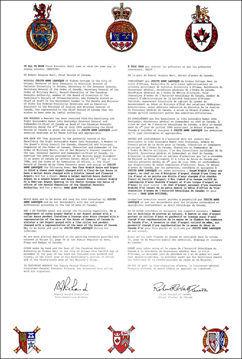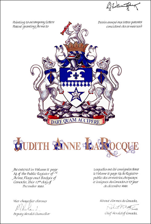 Armoiries de Judith Anne LaRocqueBlasonCoupé-érablé d'azur sur argent, en chef un roc d'échiquier d'argent chargé d'une fleur de lis d'azur et en pointe une étoile d'azur chargée d'un chardon fleuri et feuillé d'argent; |