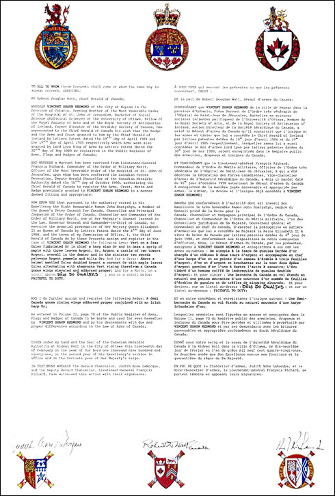 Armoiries de Vincent Shaun RedmondBlasonDe sinople à la fasce de gueules bordée d'or chargée d'un château à deux tours d'argent et accompagnée en chef d'une harpe d'or et en pointe d'un rameau d'érable à trois feuilles d'argent, d'or et d'argent et brochantes sur le tout deux épées d'argent garnies d'or l'une à dextre l'autre à senestre; |