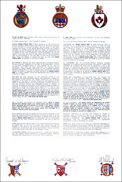 Armoiries de George Cuthill WattBlasonD'argent à un chêne croissant sur un monticule de sinople mouvant de la pointe, au chef de sable chargé d'un livre ouvert au naturel à la reliure et à la tranche d'or accosté de deux gerbes de blé d'or le tout enclos dans une bordure coupée à la hauteur du chef d'or sur sinople; SymbolismeCes armes canadiennes sont basées sur les armes écossaises concédées en 1987 à David Brand Watt III, un des cousins germains de M. Watt. On y trouve un chêne sur un monticule de verdure, symbole héraldique écossais longtemps associé aux membres de familles Watt. Le livre et les épis de blé représentent le grand-père de M. Watt, David Brand Watt I, un enseignant qui était le fils de James Watt et le petit-fils de John Watt, tous deux boulangers à Dunfermline, Fife. La bordure différentie ces armes de celles de David Brand Watt III. |